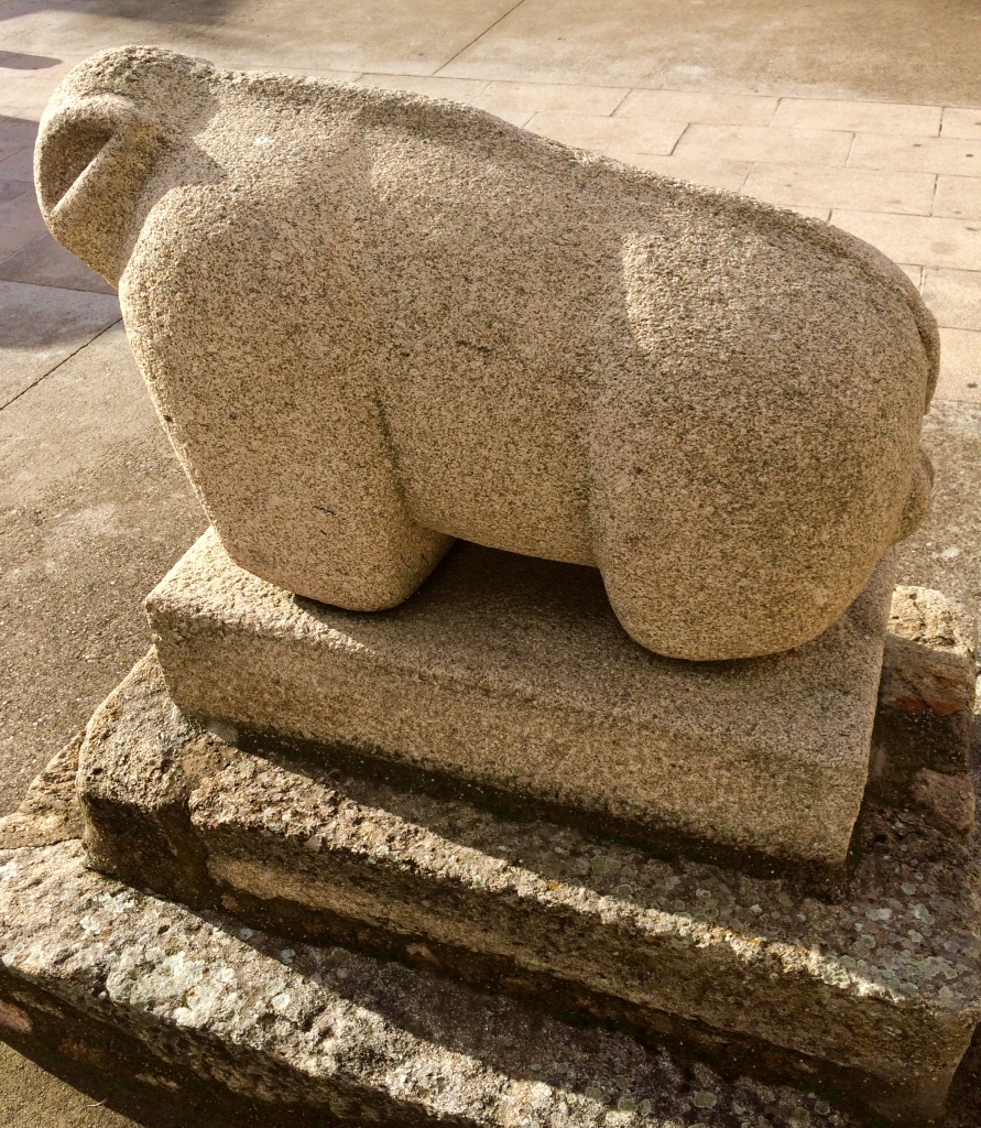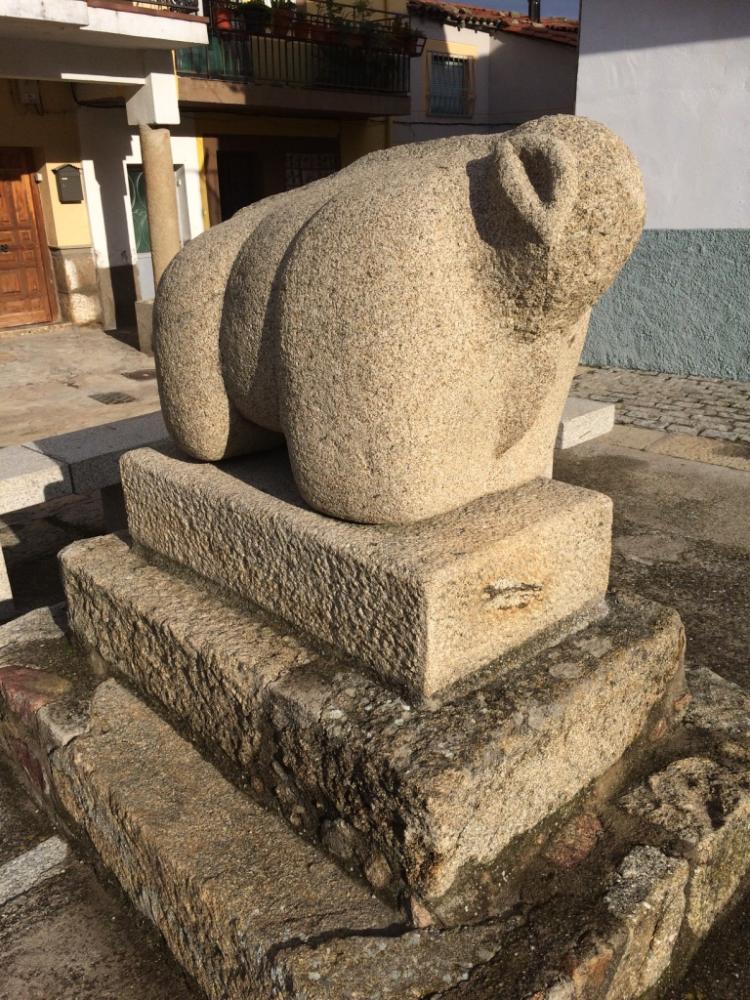 Este Verraco de menor tamaño, también de origen Vetón, se encuentra expuesto en la plaza, aunque se trata de una réplica , ya que el original encontrado en este pueblo, se encuentra expuesto en el Museo de las Veletas de Cáceres, al igual que la Estela del Guerrero del original.